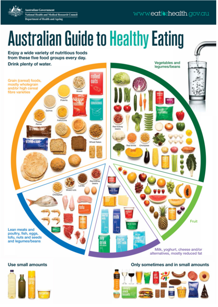- Aim to eat a variety of foods from the five food groups each day (see Australian Guide to Healthy Eating for food groups image below).